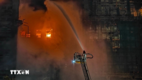Lính cứu hỏa nỗ lực dập lửa tại hiện trường cháy tòa chung cư ở quận Tai Po, Hong Kong (Trung Quốc) ngày 26/11. (Ảnh: THX/TTXVN) |