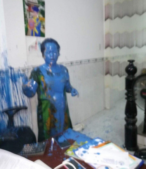 Toàn thân chị Chi bê bết sơn sau khi bị kẻ lạ hất thùng sơn vào người |