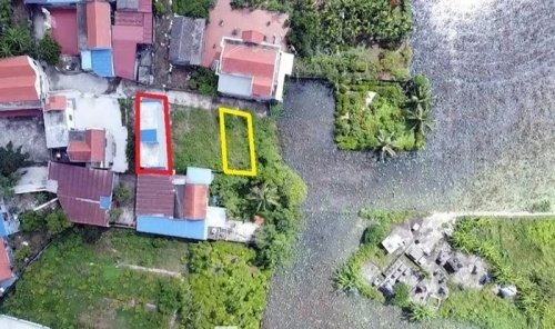 Ngôi nhà 2 tầng "xây nhầm" ( ô khoanh đỏ) trên thửa đất của gia đình bà Trần Thị Kim L. Lô đất của ông Đỗ Văn H. cách đó chừng 20-30 m (ô khoanh vàng) |