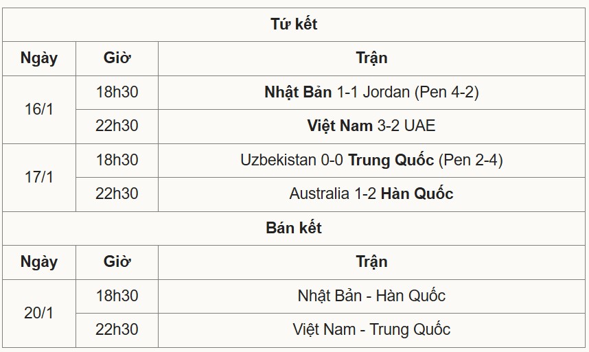 Theo đó, bán kết diễn ra vào ngày 20/1. Hàn Quốc đấu Nhật Bản lúc 18h30, còn Việt Nam đối đầu Trung Quốc lúc 22h30.