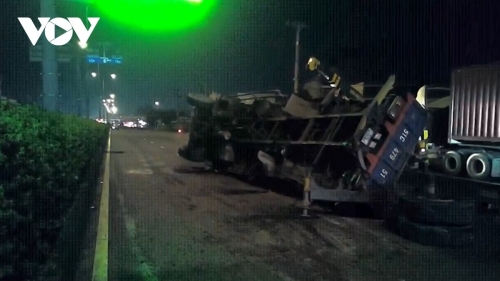 Theo thông tin ban đầu, khoảng 21 giờ 50, người đi đường hốt hoảng khi bất ngờ nghe tiếng đổ lớn, ngay sau đó chiếc xe cẩu chở trụ bê tông lật mạnh xuống đường. Lúc này, trong canin có 1 tài xế và 1 phụ xe, do vụ va chạm mạnh khiến cả 2 bị thương, được người đi đường hỗ trợ thoát ra ngoài.
