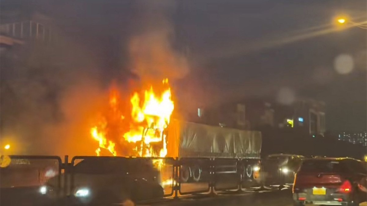 Xe đầu kéo bất ngờ bốc cháy dữ dội khiến giao thông bị ùn ứ
