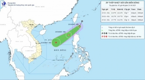 Dự báo đến 1h ngày 24/10, áp thấp nhiệt đới đi về hướng Nam, Tây Nam, với tốc độ 20-25km/h. Vị trí áp thấp nhiệt đới ở trên vùng biển phía Đông khu vực Bắc Biển Đông, với cường độ cấp 6-7, giật cấp 9. Cấp độ rủi ro thiên tai cấp 3.